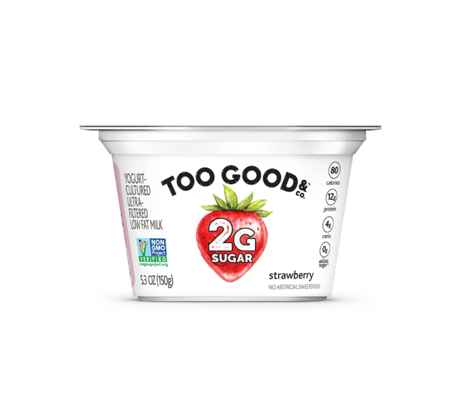 Too Good Greek Yogurt Designed specifically for individuals monitoring their sugar consumption, each serving contains just 2 grams of sugar and delivers an impressive 12 grams of protein. Sweetened naturally with stevia and authentic fruit purées, Too Good provides a mildly sweet profile devoid of extra calories. This makes it ideal for people aiming to lose weight or control their blood glucose levels. Offering 12 delightful flavors ranging from traditional choices such as Strawberry, Blueberry, and Vanilla, to more distinctive ones like Pumpkin, Key Lime, and Meyer Lemon, there’s always a satisfying option available that aligns with your nutritional objectives.